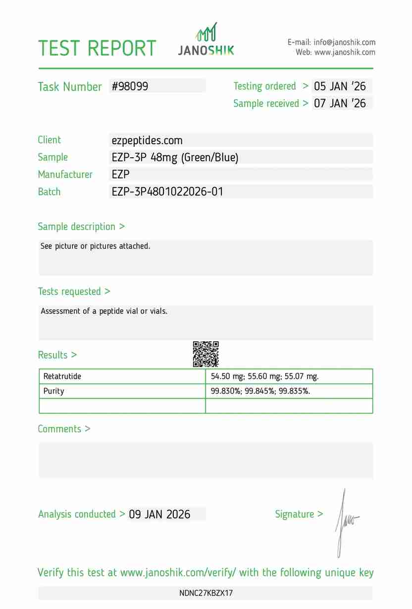 EZP-3P 48mg is a research-grade compound supplied in a sterile vial, intended for use in controlled laboratory settings. It undergoes analytical verification to ensure purity and consistency.