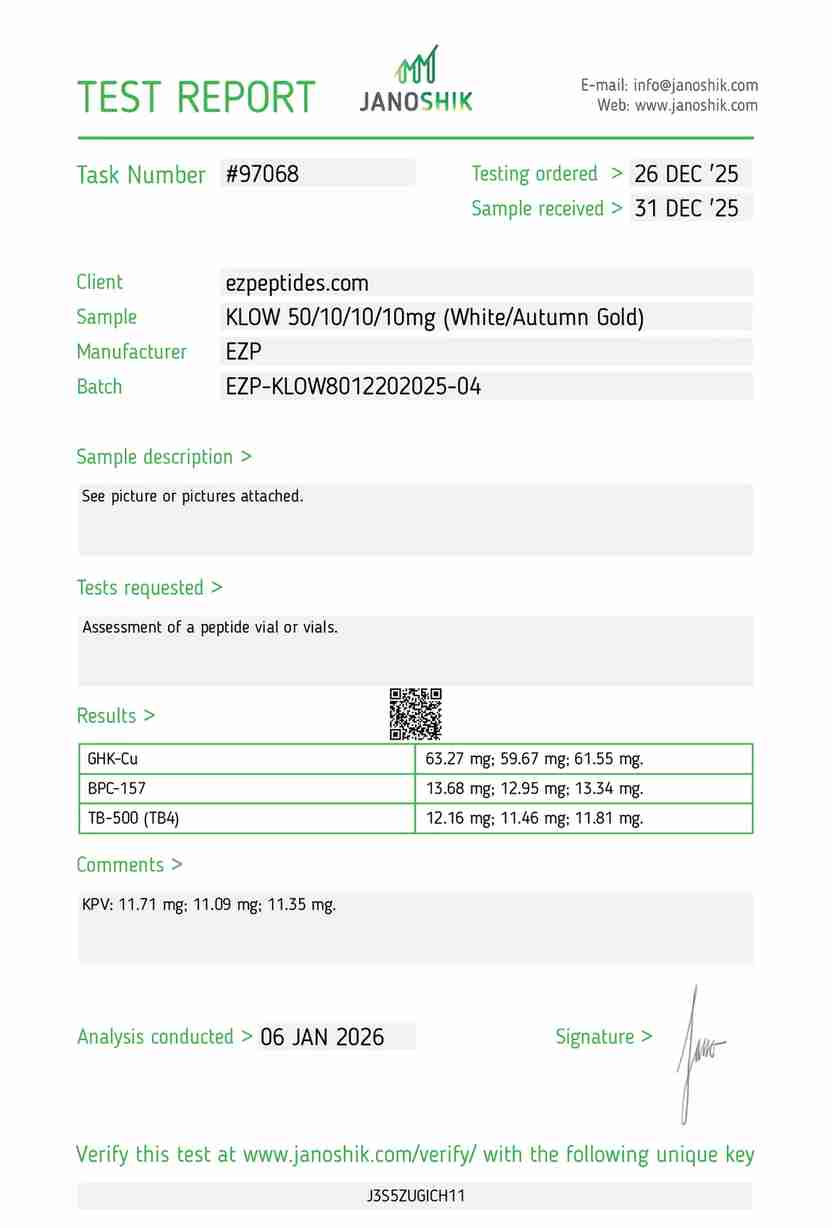 Klow Blend 80mg is a research-grade peptide blend supplied in a sterile vial, intended exclusively for use in controlled laboratory environments. Each batch is tested to ensure high purity and consistency for research applications.