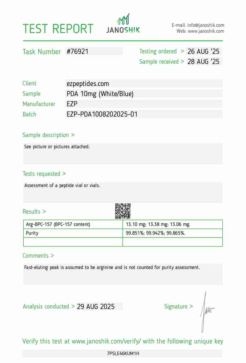 PDA 10mg is a research-grade compound provided in a sterile sealed vial, intended exclusively for controlled laboratory studies. Each batch is analytically verified to ensure purity and consistency, supporting accurate and reliable experimental applications.